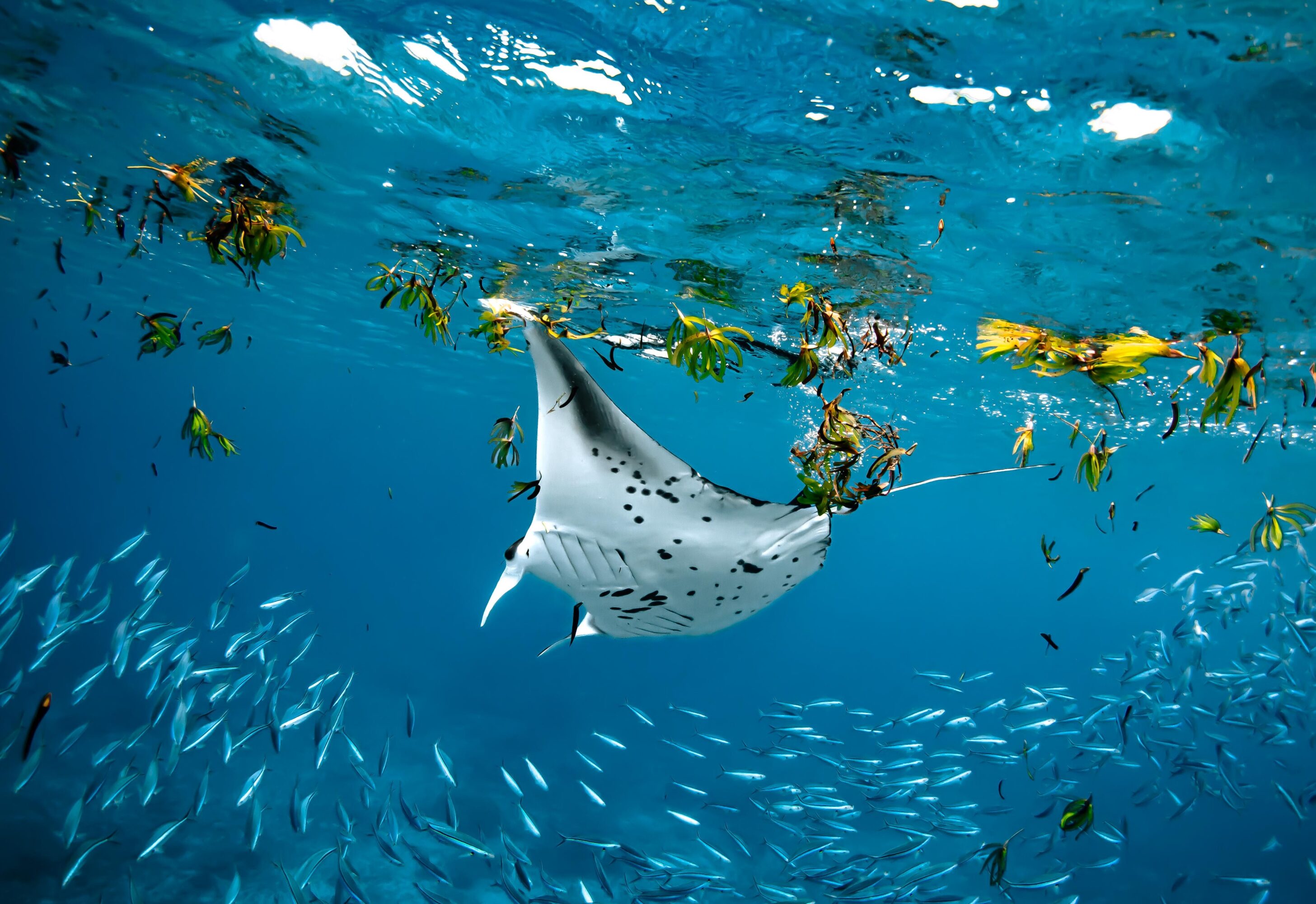 Alfie the manta ray surface-feeding alongside fusiliers, with seagrass floating around like confetti. Photo by Dillys Pouponeau | © Save Our Seas Foundation