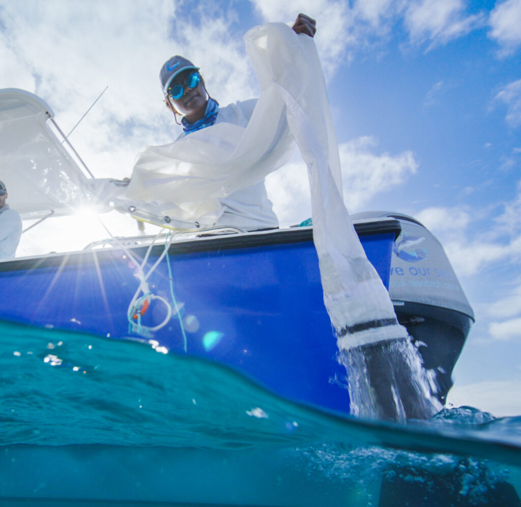 Dillys and the team collect a plankton sample near a feeding manta ray. Photo by Henriette Grimmel | © Save Our Seas Foundation