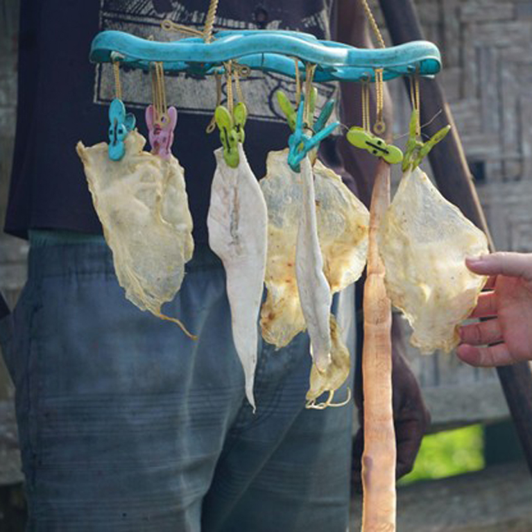 Inshore fishing in Papua New Guinea has shifted towards targeting fishes’ swim bladders for a high-end dried product in the east Asian market. Although the most prized swim bladders are generally those of croakers (Sciaendiae), which can be worth up to US$25,000 per kilogram (dried weight) in end-user markets, most large-bodied estuarine fish species are also highly valued. Papua New Guinea has little data about inshore and riverine fisheries and lacks legislation for them, so swim-bladder fisheries are effectively unmanaged.