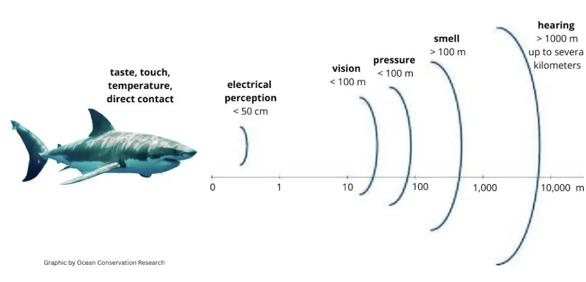 In the ocean, sound is simply a vibration you can feel. While humans use ears to hear and skin to touch, sharks use a sophisticated system of ‘hair cells’ and water-filled canals to ‘feel’ sound. Sharks have no outer ears, only a small opening behind each eye, and are highly sensitive to low-frequency sound vibrations. Some species can even pinpoint the exact direction they come from.