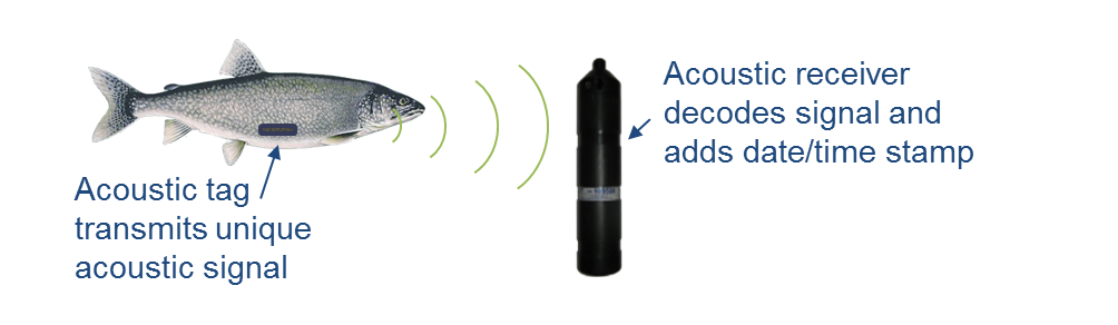 An example of how an acoustic tag 'talks' to an acoustic receiver to document an animal's presence at a given time and place. Image © Great Lakes Acoustic Telemetry Observation System