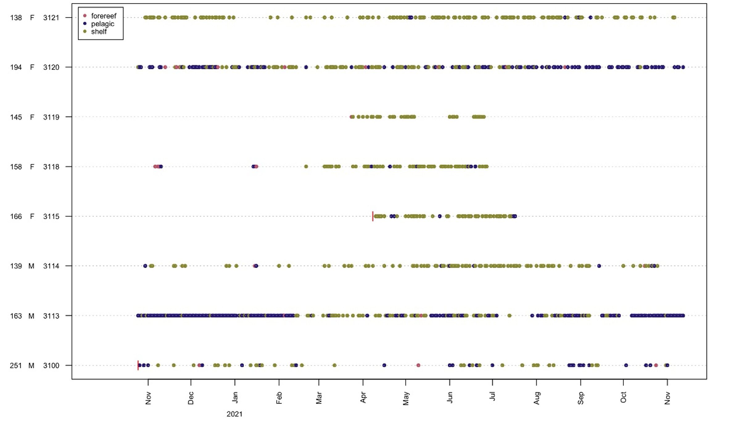 An established array of twelve acoustic receivers positioned nearby and at the buoy has allowed our team to monitor residency and movement patterns; we are excited to share some preliminary findings. When we started this project, we presumed that the silky sharks would leave the buoy from time-to-time or exhibit no fidelity at all. And of the 51 silky sharks we have tagged, most do leave the buoy, whether it be on a seasonal or daily basis. But some silkies are unique and seem to have much more fidelity to the buoy and local area, residing for extended lengths. For example, we have numerous sharks that have appeared to establish a year-round residency at the buoy and surrounding habitats. And many like to move between habitats from the pelagic zone to the drop off (shelf) and occasionally onto the fore-reef. What could be driving this, perhaps size or sex or temporal pulses in prey availability? Is their residency affected by sociality? Stay tuned for our next blog where we will address more of our results.