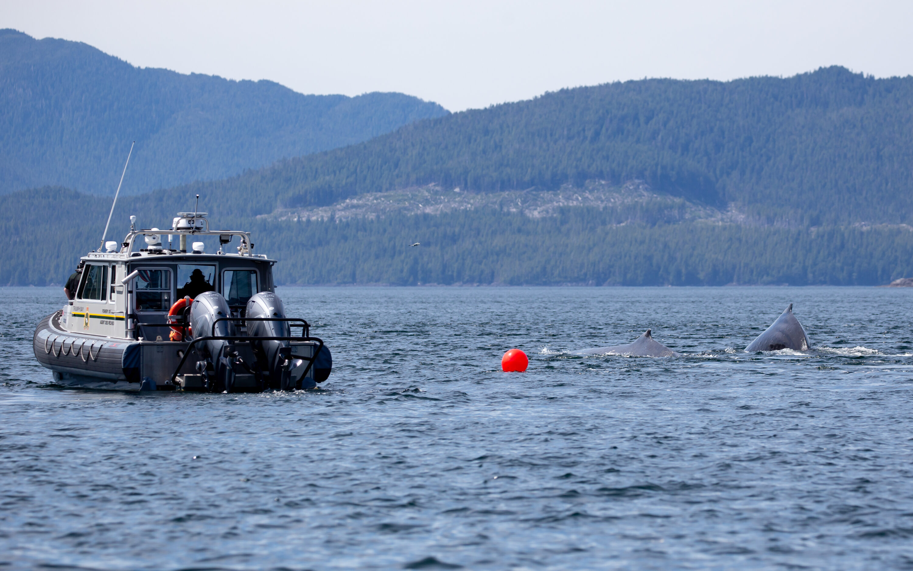 With heavy eyelids, I made my way to our boat on the fourth day. I really did not know what to expect, but I knew we had to keep giving it our all to find and free this whale. Hannah, Zoey, and I set off towards the top of Lewis Passage and Wright Sound – Marbles last known location. I had never seen so many whales at the same time in these places. There were easily over 40 humpback and fin whales, and among all of them – we had to find 1 specific whale. Hermann was also back on the water continuing the search in further reaches of Wright Sound and Whale Channel. Paul and the fisheries team were on their way from Kitimat and would be joining the search once they arrived. We searched for almost 4 hours before we got the call on the radio from Paul that they found Marble and it was now a waiting game for her to slow enough so that they could finally start the disentanglement.