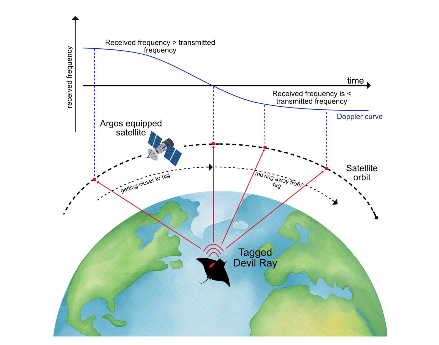Figure 1. Graphic depicting how Argos calculates location data from transmissions received from remote platforms such as animal-borne satellite tags. As a satellite approaches a transmitter (i.e., a tagged sicklefin devil ray) the tag’s transmission frequency increases. However, once the satellite passes over the transmitter and begins to move away from it, the frequency of transmission decreases. The pattern of these frequency shifts is analysed at Argos operations centres to calculate location data wherein the degree of accuracy is dictated by the number of transmissions received. Locations are ranked as either Class 3, 2, 1, 0, A, B, and Z; wherein a class 3 position is the most accurate (within 250m), class B is the least accurate (no defined error radius), and class Z locations are considered invalid (Argos User Manual, 2016). The mobula vector used in this graphic was created © Eloisa Pinheiro Giareta and was edited by Sophie Prendergast to depict a tag. The original vector can be found here. The satellite vector © Getty Images, and the globe graphic © Maya Sagita
