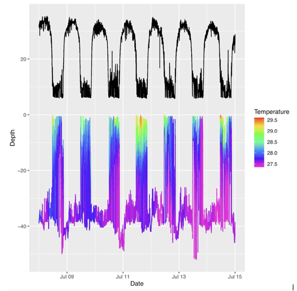 Back at the lab, Riyar was able to download a high resolution archival dataset – a fancy way of saying we got loads of data!). Kevin plotted up the depth, temperature and light record to see what this little guy had been up to.