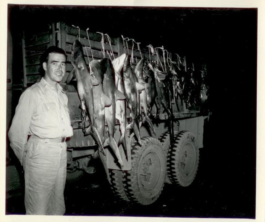 Museum archive image of sharks captured at Ascension Island. Analysis of archive sources suggest that human-shark interactions were historically common. Image © Ascension Island Heritage Society.
