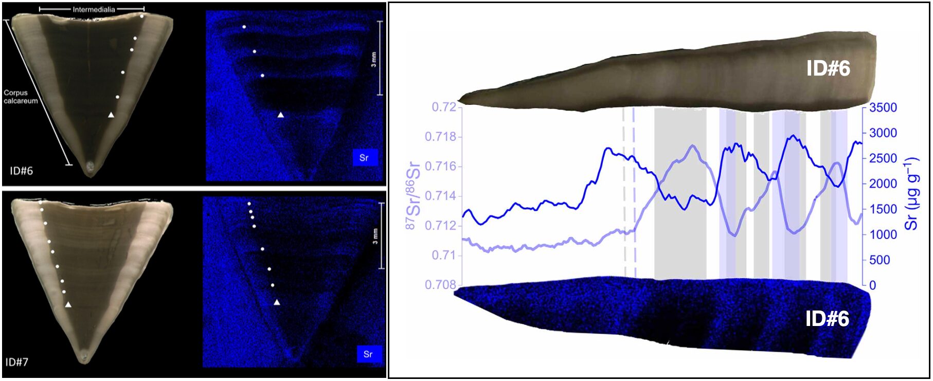 A side-by-side of shark vertebrae TLOM, mXRF Sr and LA-MC-ICP-MS. Figures © Lewis et al. (2024)