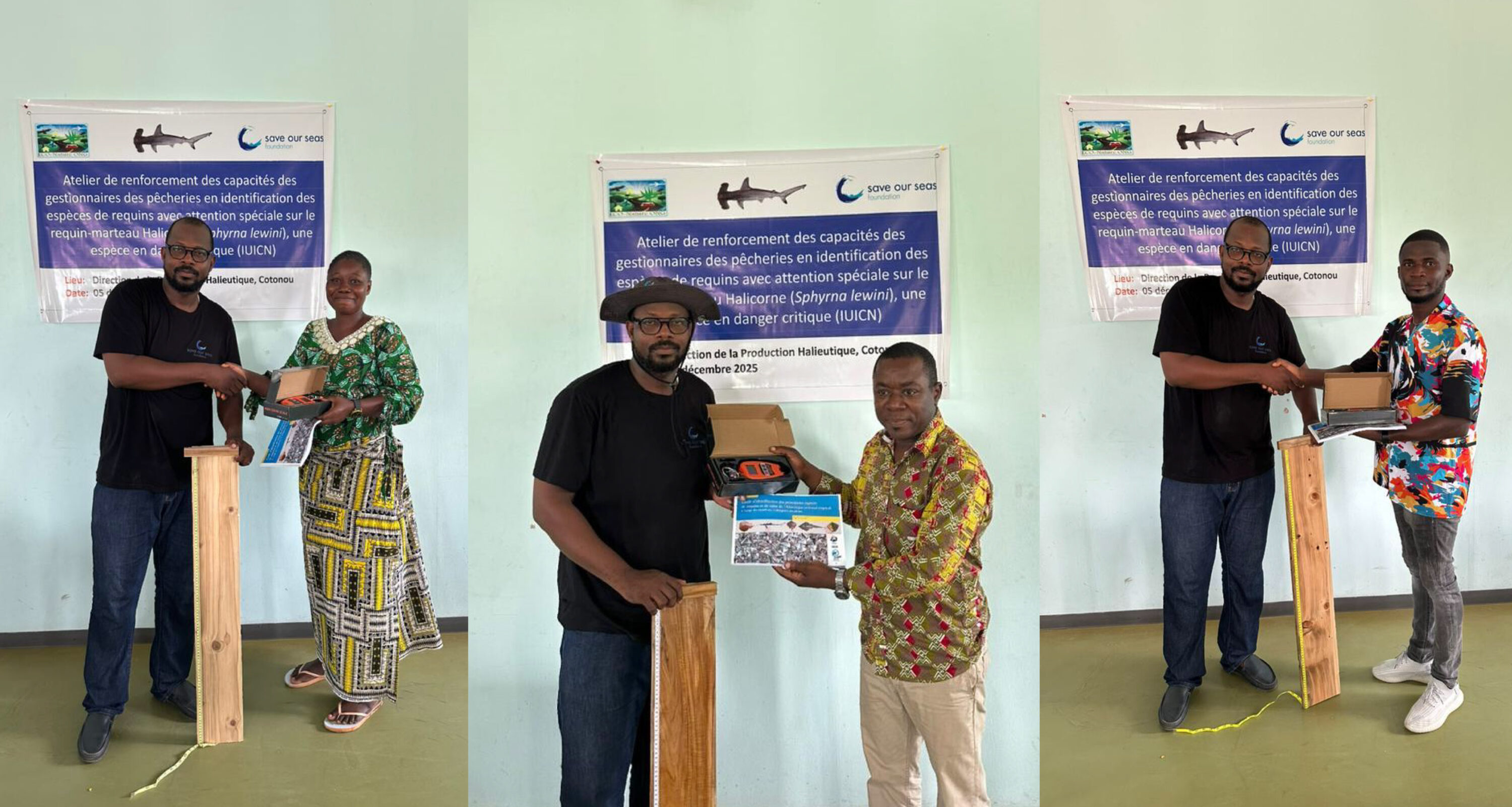 The training followed a participatory and interactive approach. Carefully prepared modules combined theory with practical exercises, ensuring that participants could immediately apply what they learned. By the end of the workshop, participants reported high satisfaction with the organisation and content. More importantly, they are now equipped to accurately identify the scalloped hammerhead, a mandatory skill for improving monitoring systems and supporting conservation measures nationwide.To reinforce field application, each participant received essential equipment, including a weighing scale, an ichthyometer and a shark identification guide These tools will directly support data collection and marine biodiversity monitoring efforts across coastal Benin.