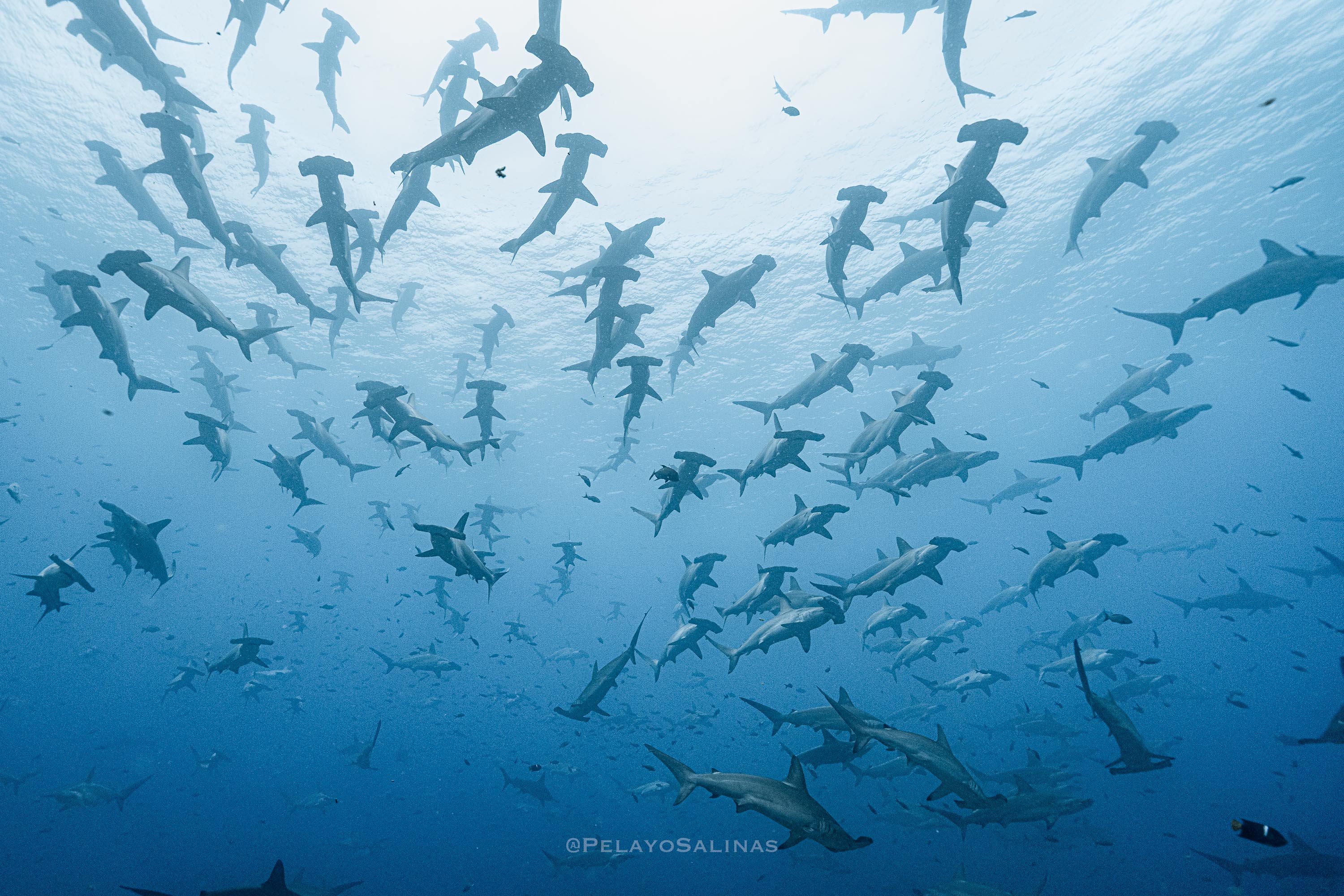 Glimpses of the ocean of the past: A shiver of scalloped hammerhead sharks at Darwin Island. Photo © Pelayo Salinas | Charles Darwin Foundation