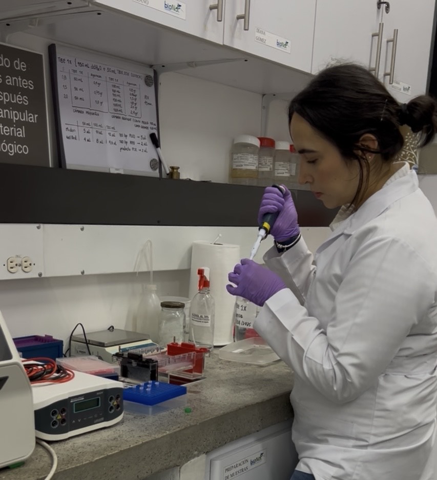 Laura González Gordon performing laboratory procedures for DNA extraction and analysis to genetically evaluate the spotted eagle ray species in Malpelo Island, Colombia. This work contributes to species identification and conservation efforts. Photo © Yenifer Guerrero