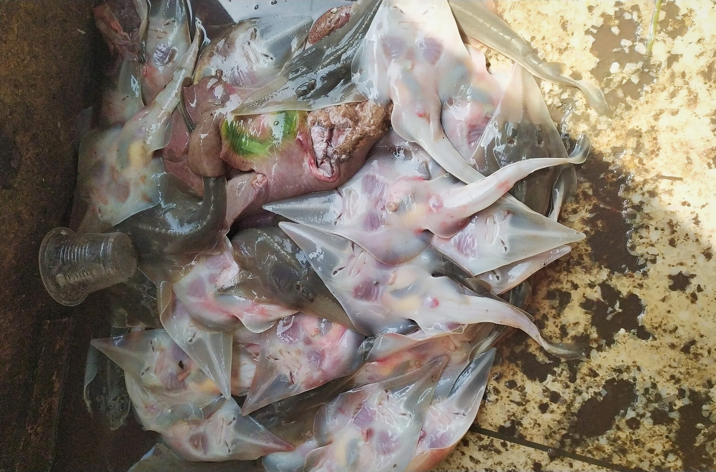 A pile of sharpnose guitarfish found at a landing site corner: evidence of unsustainable fishing practices driving the species towards extinction. Photo © Antu Raha Durjoy